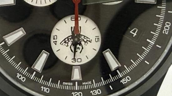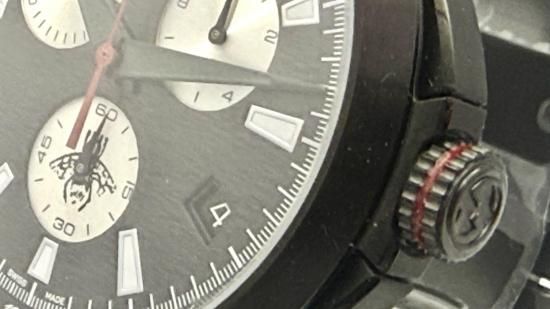 ・この時計は44mmのケースサイズと13mmの厚さで、存在感がありながらも快適な装着感を実現しています。ブラックの文字盤は視認性が高く、傷がつきにくいサファイアクリスタルガラスで保護されています。防水性能は50mまで対応しており、日常生活の水しぶきや雨にも耐えられる設計です。