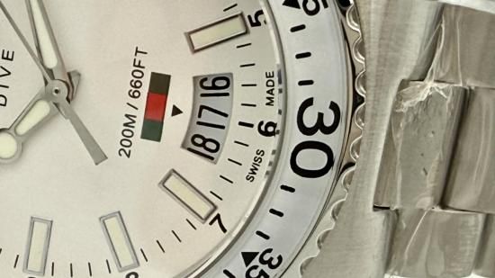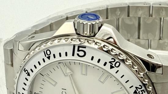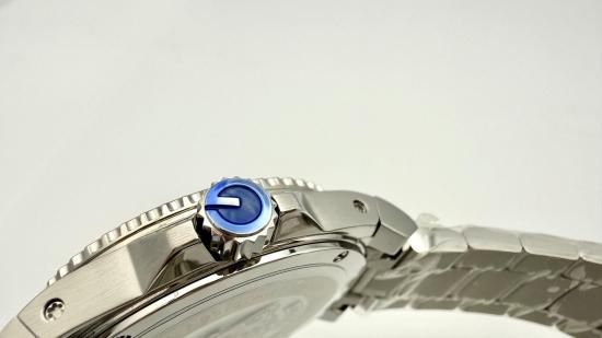 45mmの大きめなケースは、しっかりとした存在感を持ちながらも、腕にフィットするデザインです。傷がつきにくいサファイアクリスタルガラスが採用され、時計の美しさを保ちつつ視認性を高めます。200m防水機能を備え、本格的なダイビングにも対応できる優れた防水性能を誇ります。
