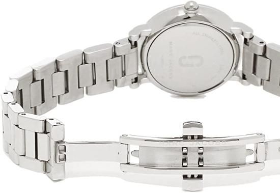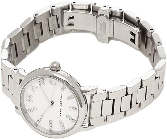マークジェイコブスの「MJ3568 レディースウォッチ」は、シルバーの洗練された輝きと、エレガントなクリスタル装飾が魅力的なファッションウォッチです。文字盤には、「MARC」の文字を形作るようにクリスタルが配置されており、シンプルながらもラグジュアリーな印象を与えます。